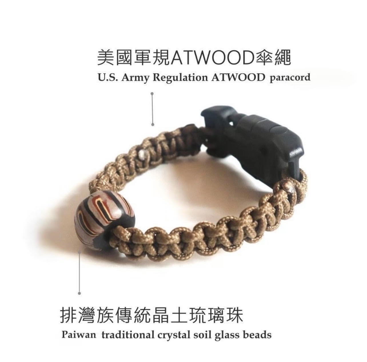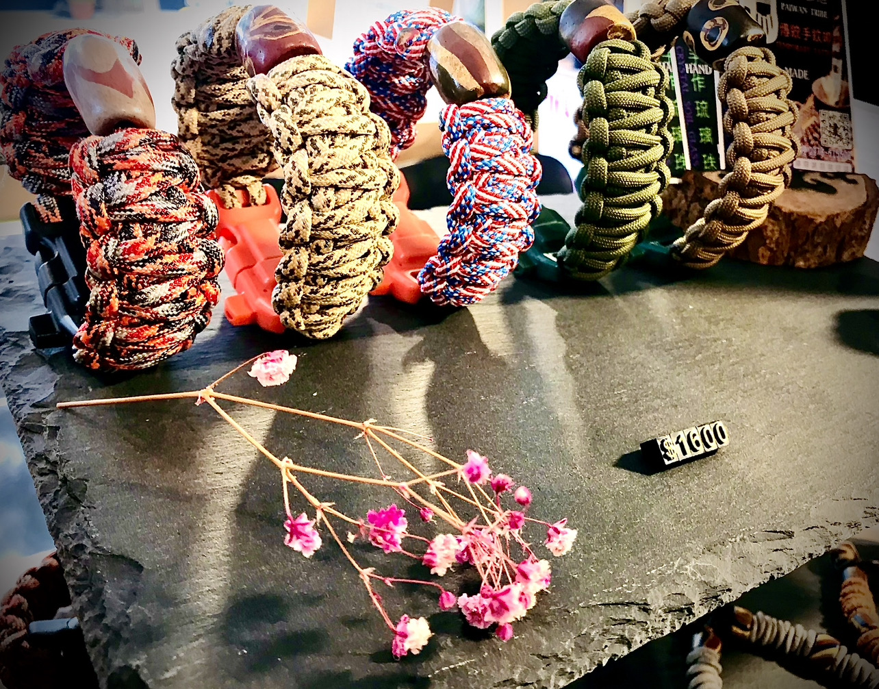 結合美國 Atwood 傘繩與排灣族琉璃珠,兼具文化與實用性。內含指北針、打火石、高音哨與刀片,拉力達 550 磅,是登山、露營的好夥伴。戴上它,既傳承文化,也向自然致敬。